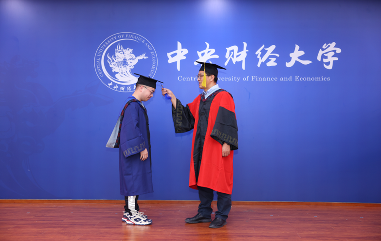 中财史蒂文斯项目中方负责人、副院长荆中博老师主持学位授予仪式,毕业生们逐一上台,刘志东院长为同学们颁发美方学位证书和中财结业证书,拨穗正冠。