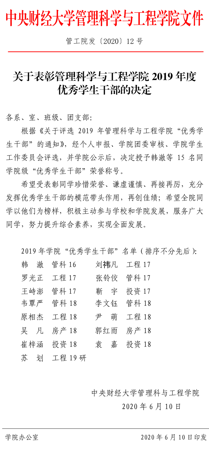 关于表彰beat365英国官方网站2019年度优秀学生干部的决定