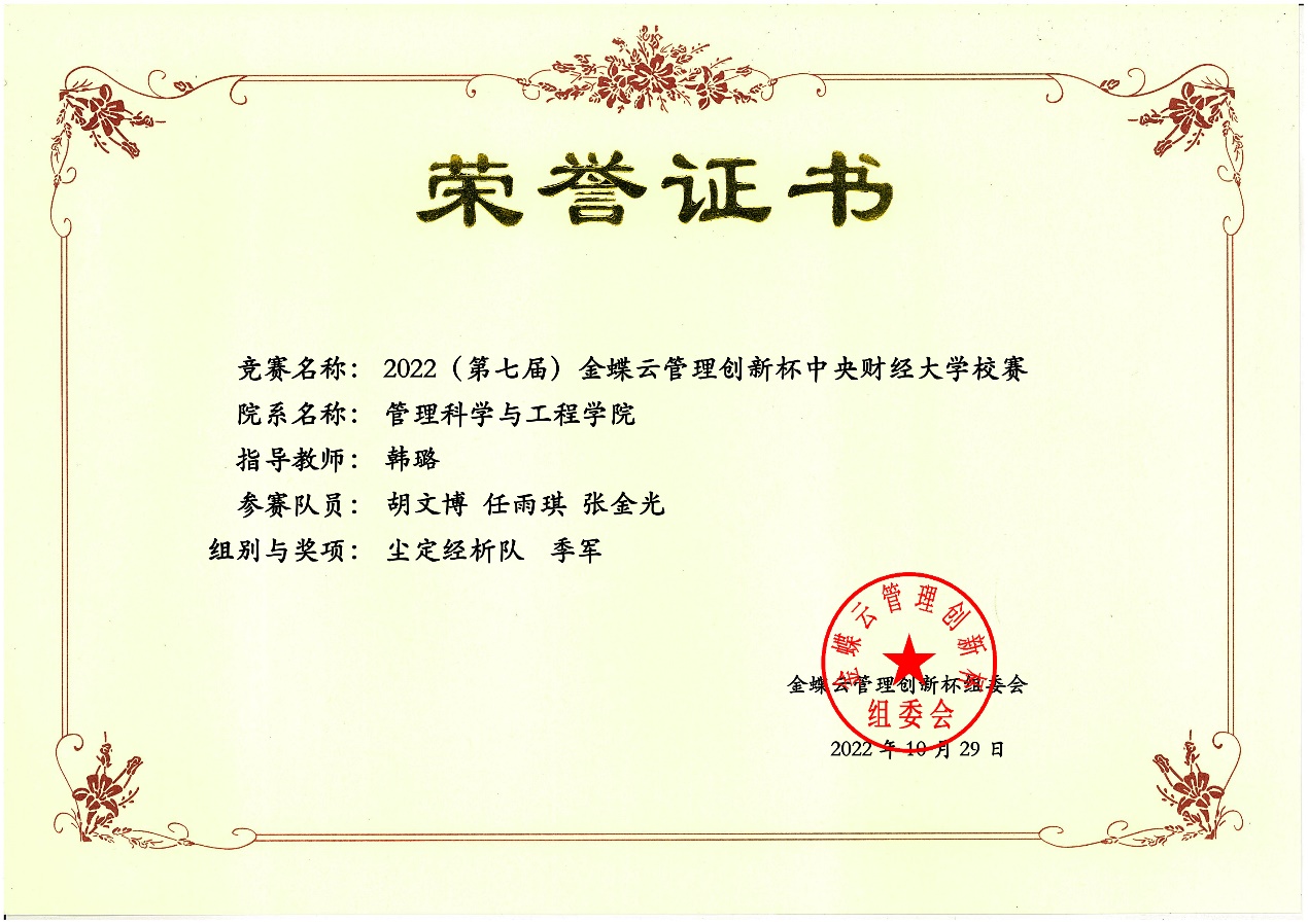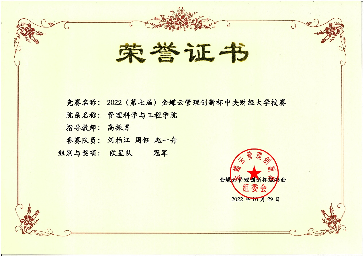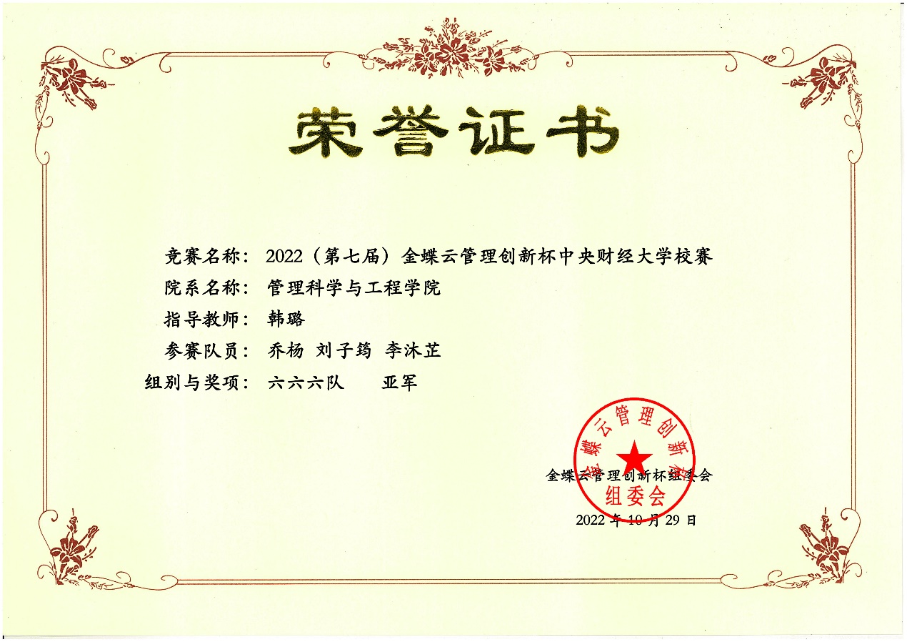 2022年10月29日上午9:00至12:00,“第七届金蝶云管理创新杯大赛”beat365英国官方网站校赛(以下简称校赛)成功举办。beat365官网管理科学2020级本科生刘柏江、周钰、赵一舟以团队97分的评分摘得桂冠,管理科学2020级本科生乔杨、刘子筠、会计2021级本科生李沐芷以团队92分的评分获得亚军,管理科学2020级本科生胡文博、任雨琪、张金光以团队91.5分的评分获得季军,三支队伍代表学校成功晋级区域赛。