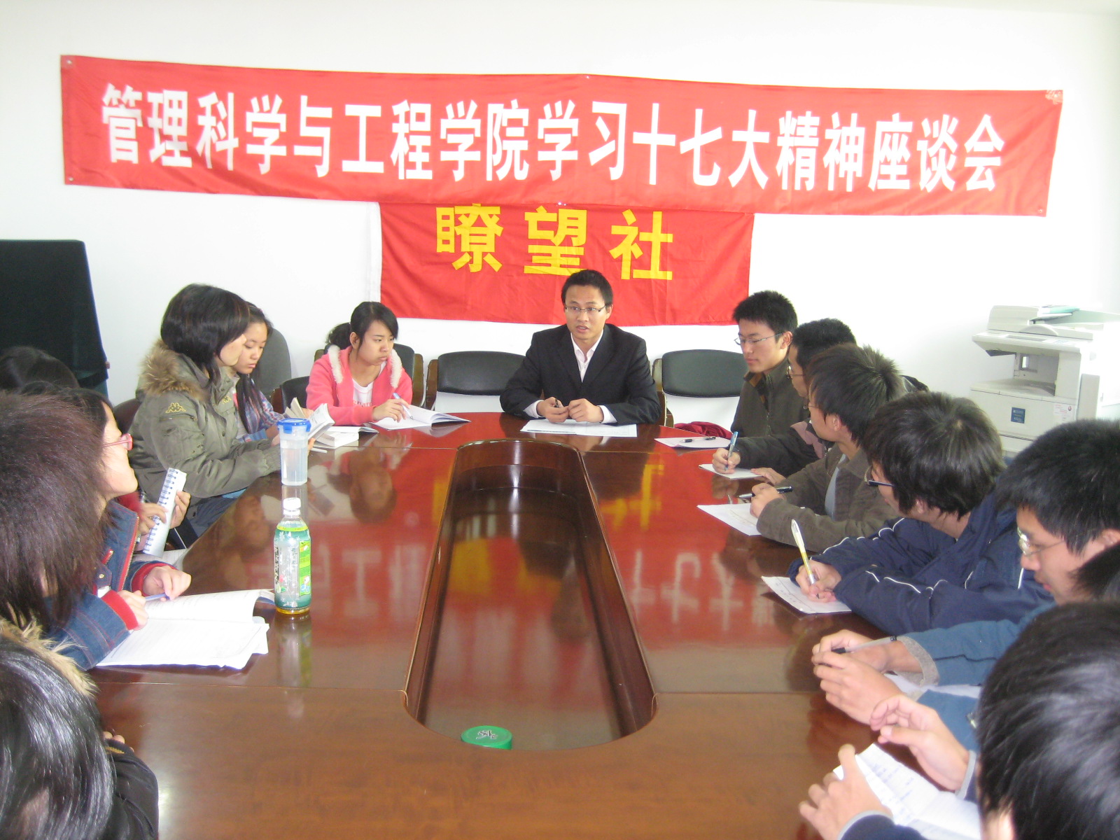 10月30日中午,我校瞭望社学习十七大精神座谈会在beat365英国官方网站会议室召开。瞭望社指导老师朱继光出席会议并讲话。