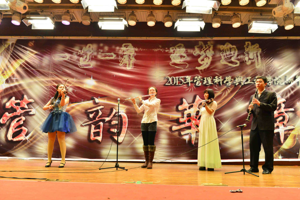 随后,管科13的同学们为我们上演了情意绵绵、精彩纷呈的舞台剧《来自星星的你》。深情款款的韩剧版、夸张幽默的琼瑶版、直爽搞笑的东北版,都因为“东方蓝翔艺术学院”招生面试汇集在一起,也都因为管工大家庭而汇聚于此。紧接着,胡昊楠、查又菲、王玥、张笑竹带来管弦乐合奏:《鸿雁》串音乐之声组曲《多来咪》、《孤独的牧羊人》和《雪绒花》。在优美的和弦中,仿佛夜空也因此变得澄澈,心灵也因此变得纯净……连马里奥都忍不住上台指挥,深深沉醉其中。
