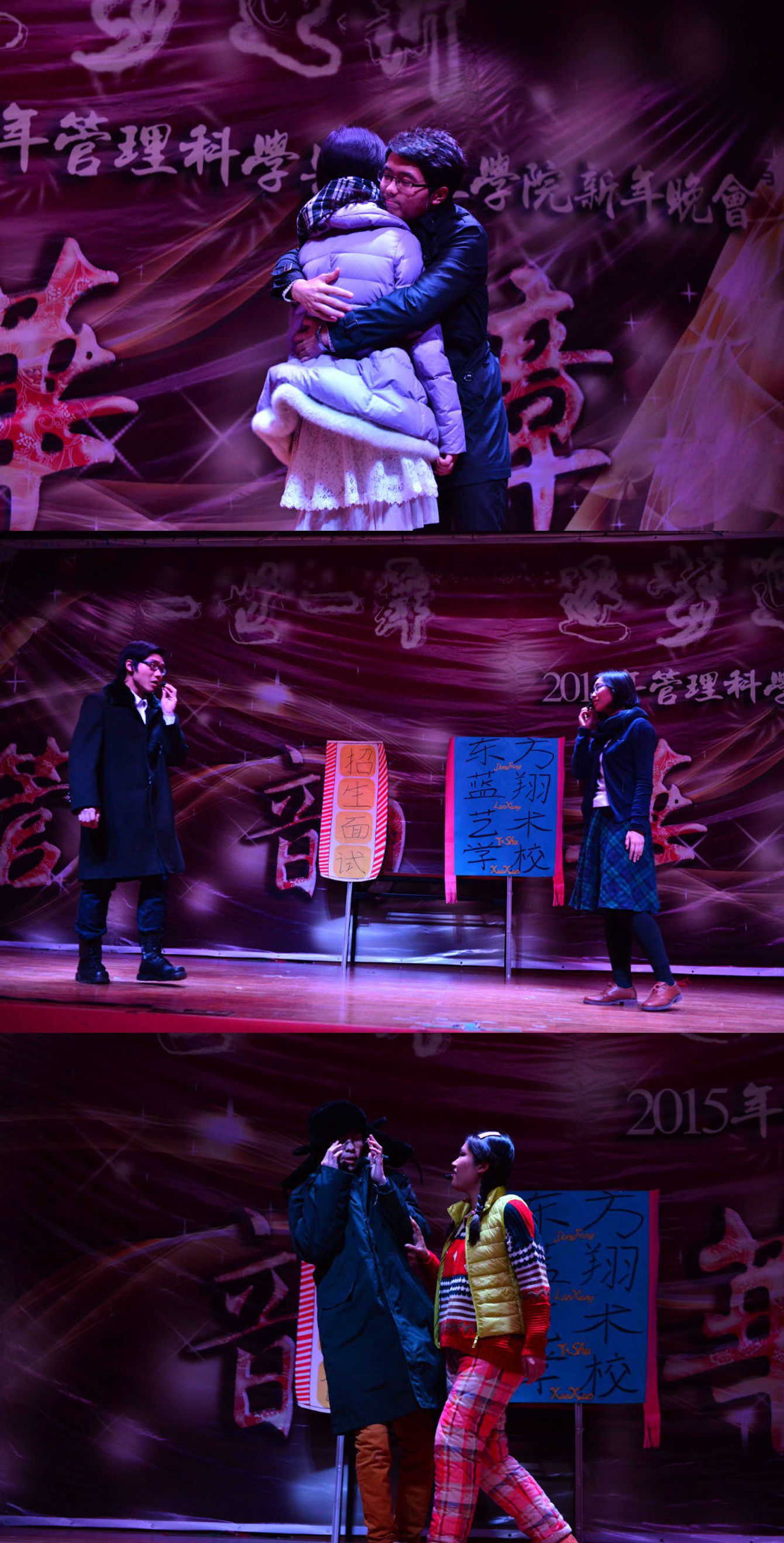 还未从美妙的歌声中回过神来,11级同学就已登上了舞台。据了解11级表演的都是已经保研的同学,看到日常的学霸此刻能歌善舞,彩色荧光的牛角头饰加上一大群男生女生欢快唱跳《barbarbar》,让观众仿佛看到了那个甜美童真的自己。在一群搞怪大咖们跳完舞后,身着长衫大褂的廖原和战昶威便开始“求学问道”了。两个人的这段相声一捧一逗、插科打诨。“运筹学简单啊,贾老师都乐了”、“学霸我可不敢当,叫我学神就好”,一个个贴切管工人学习与生活的段子惹来在场观众频频叫好。