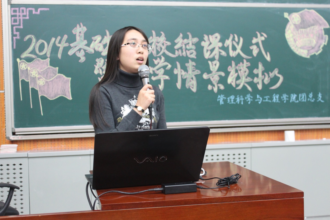 2014年12月15日晚18:30,学院2014基础团校末次课程暨结课仪式在4号学院楼107举行。团校最后一课的内容团学情景模拟,指导学员们该如何平衡工作与学习的时间,从而提高效率。团总支副书记王思维老师和所有团校学员参加课程和结业仪式。
