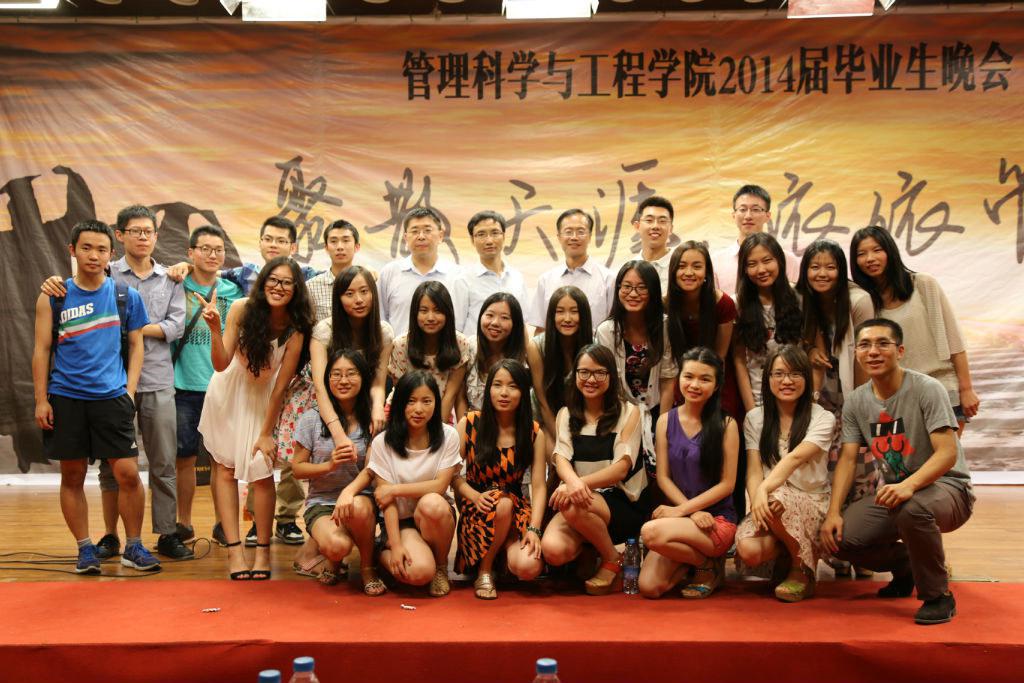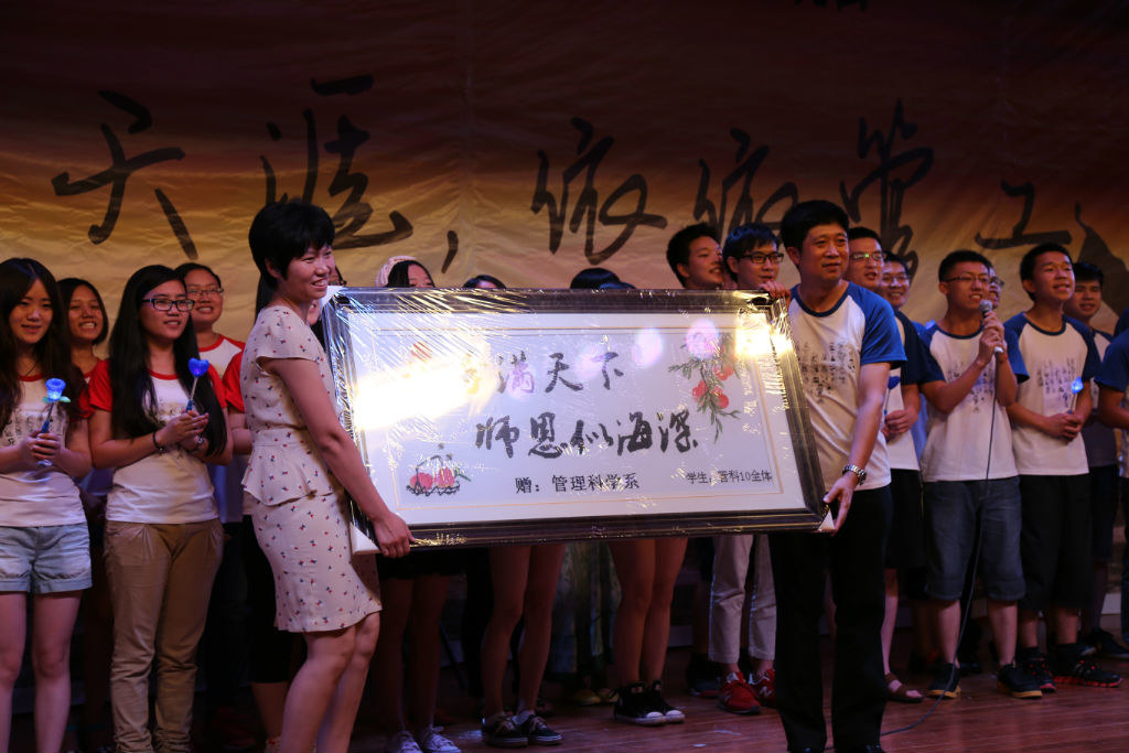 曾经作为主力阵容连续两年问鼎“中财杯”篮球赛冠军的10级的篮球队队员在临别之际对篮球队的寄语,和篮球队视频里的热血激情的比赛画面,让我们重温了那段管工“王朝模式”下激动又感动的时刻。管科10的同学们精心准备的合唱——《时间都去哪了》,让全场观众情不自禁地回忆着一路走来的点点滴滴,他们还将亲手缝制的十字绣牌匾“桃李满天下,师恩似海深”送给了培养他们四年的管理科学系。“今千里,酒一杯,声声喋喋催。问君此去几时还,来时莫徘徊。天之涯,地之角,知交半零落。一壶浊洒尽余欢,今宵别梦寒”,最后,晚会在院学生艺术团的合唱《送别》和《再回首》中落下帷幕。