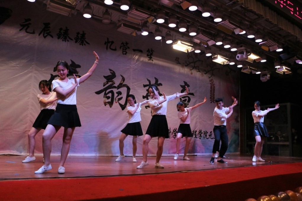 18时30分,大幕拉开。西装革履的团学骨干们用一曲《boom boompow》燃爆晚会演出现场,八仙过海各显神通,大家都拿出了自己看家的绝活,不再像平日一般不苟言笑,今天的他们在舞台上绽放出了不一样的光彩,引得场下尖叫连连。在众人的欢呼之中,穿着靓丽的五位主持人们登台亮相,共同为本场晚会带来开场词。