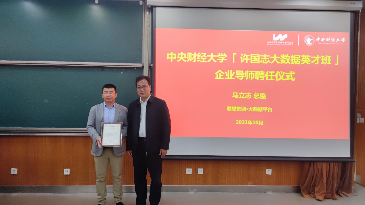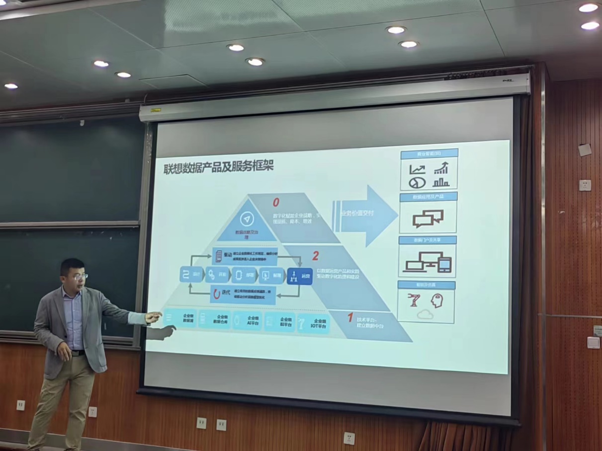 座谈会结束后,与会人员移步学院7号楼115教室,举行企业导师聘任仪式,由刘志东院长为马立志总监颁发许国志大数据英才班企业导师聘书。在之后的讲座中,马立志总监介绍了联想数据战略1.0和2.0两个阶段的建设、联想数据平台建设、数据治理及运营以及大模型等的应用探索。