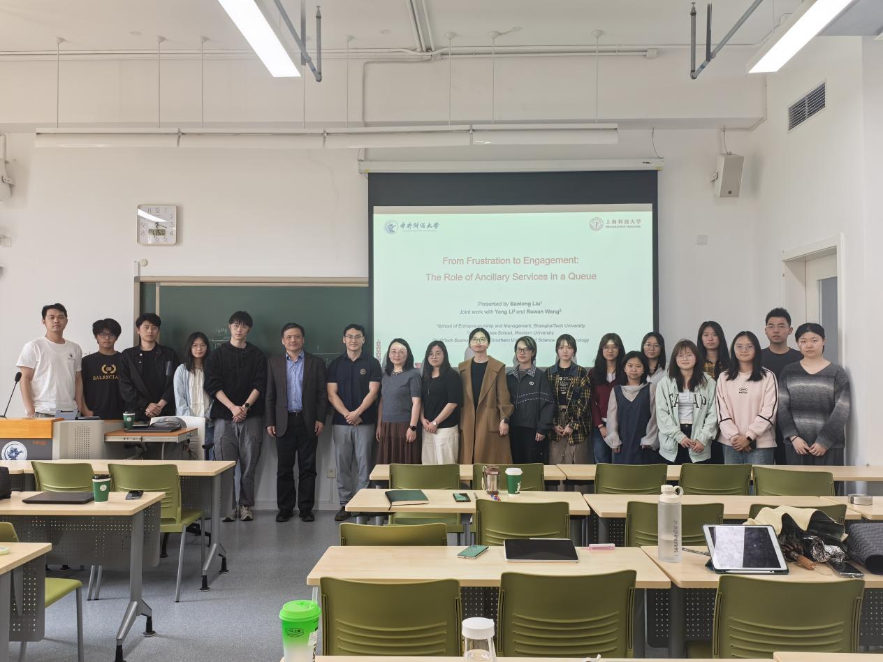 4月15日下午,应beat365英国官方网站邀请,上海科技大学创业与管理学院管理科学与工程方向助理教授刘宝龙做客“大数据与管理科学”系列讲座,报告了研究论文“From Frustration to Engagement: The Role of Ancillary Services in a Queue”。本次讲座在沙河校区二教303教室举行,陈俊霖教授主持,王金亭教授出席,投资学、管理科学等专业的本科生、硕士生及博士生认真聆听了本次讲座。