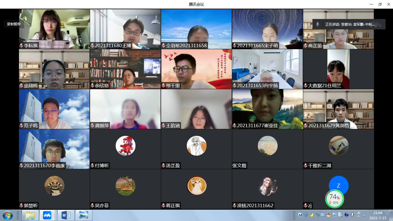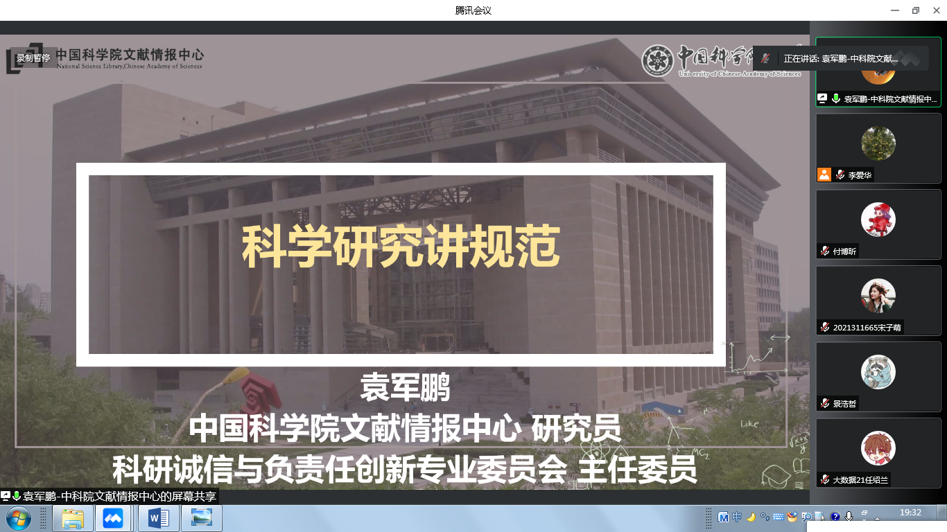 2022年7月15日晚19:30,中国科学院情报文献中心研究员、中国科学院大学岗位教授、博士生导师袁军鹏受邀来为2021级“许国志大数据英才班”同学做关于科学研究规范的讲座。