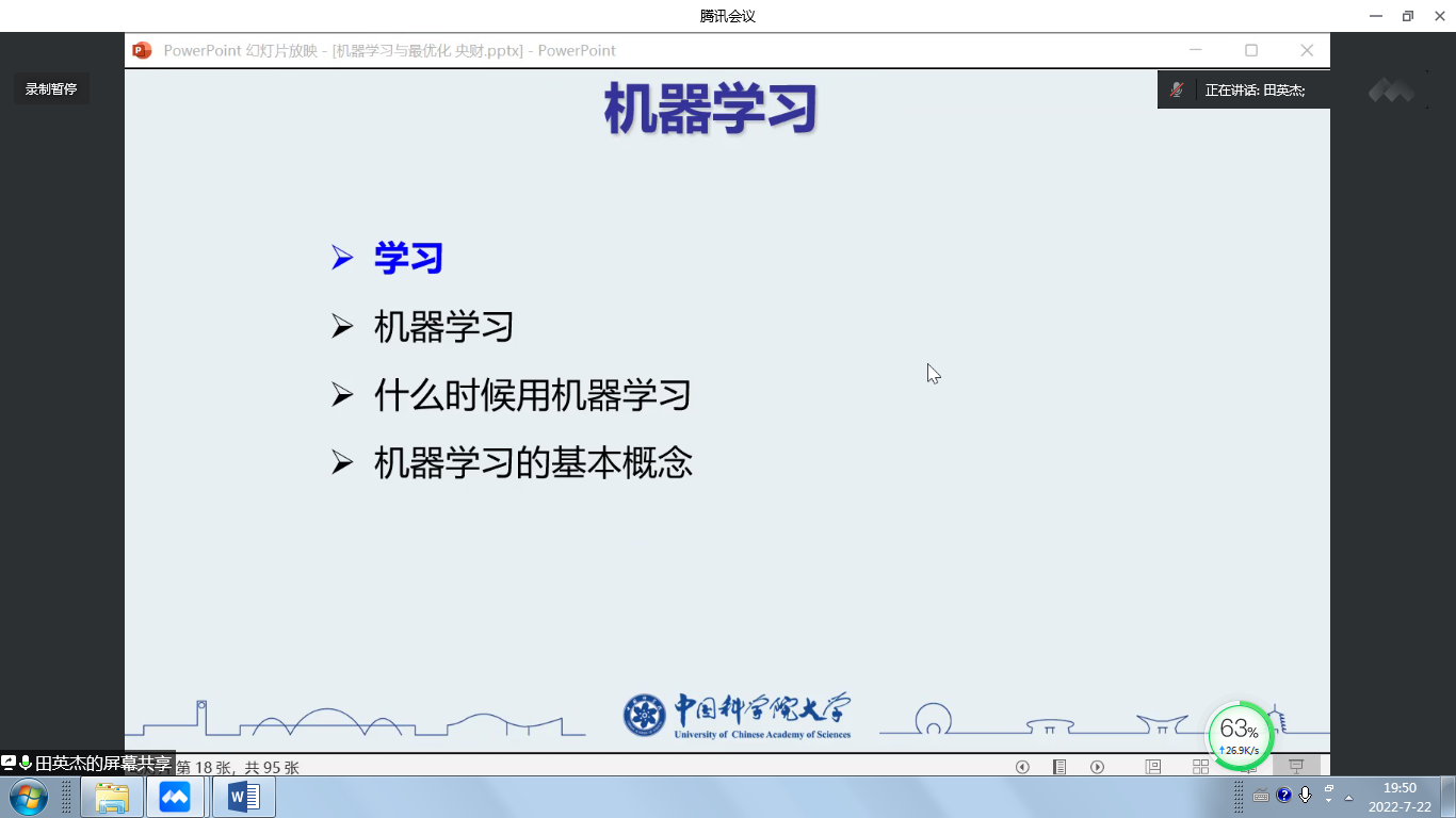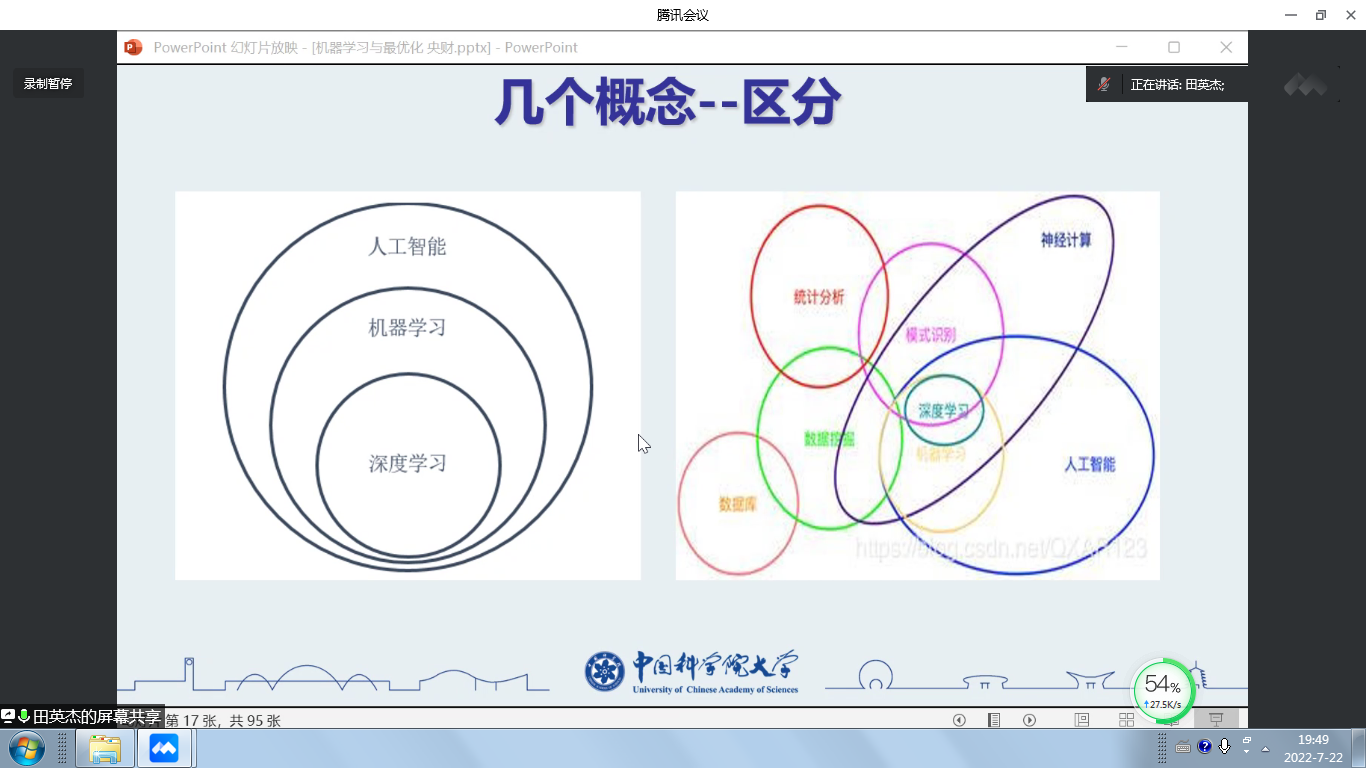 田老师是中国科学院大学经济与管理学院副院长、中国科学院虚拟经济与数据科学研究中心副主任、中国科学院大数据挖掘与知识管理重点实验室常务副主任。他深耕于人工智能、机器学习、大数据挖掘等方向的学术前沿,该讲座以“机器学习与最优化”为主题,围绕机器学习的概念、相关应用等问题展开。
