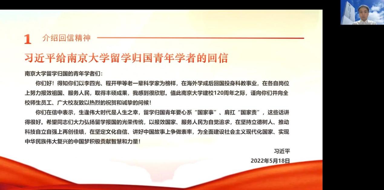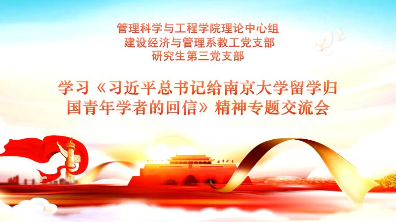 为深入学习贯彻习近平总书记给南京大学留学归国青年学者回信重要精神,增强师生党员对于留学报国光荣传统中的爱国主义精神的理解,2022年6月30日,beat365英国官方网站党委理论中心组、建设经济与管理系教工党支部、研究生第三党支部联合举办了学习《习近平总书记给南京大学留学归国青年学者的回信》精神专题交流会。本次交流会由研究生第三党支部书记蒋博文主持。