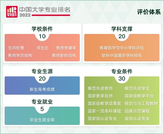 “软科中国大学专业排名”设计了独具特色的专业竞争力评价框架,通过学校——学科——专业三个层次的评价汇总形成对专业的综合评价。排名指标体系设置学校条件、学科支撑、专业生源、专业就业、专业条件5个指标类别,共19项测量指标。