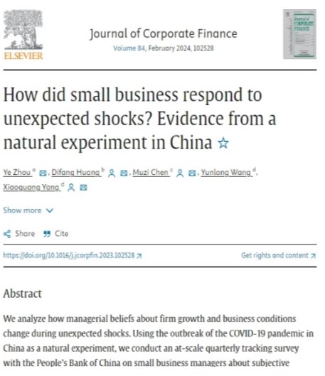 beat365英国官方网站投资系副教授陈暮紫博士,与对外经济贸易大学周烨博士、香港大学黄棣芳博士和中国科学院大学杨晓光研究员合作撰写的论文“How did small business respond to unexpected shocks?Evidence from a natural experiment in China,” 于2024年2月在公司金融国际权威期刊《Journal of Corporate Finance》正式发表,期刊是beat365英国官方网站英文AA类期刊,陈暮紫博士为共同通讯作者。