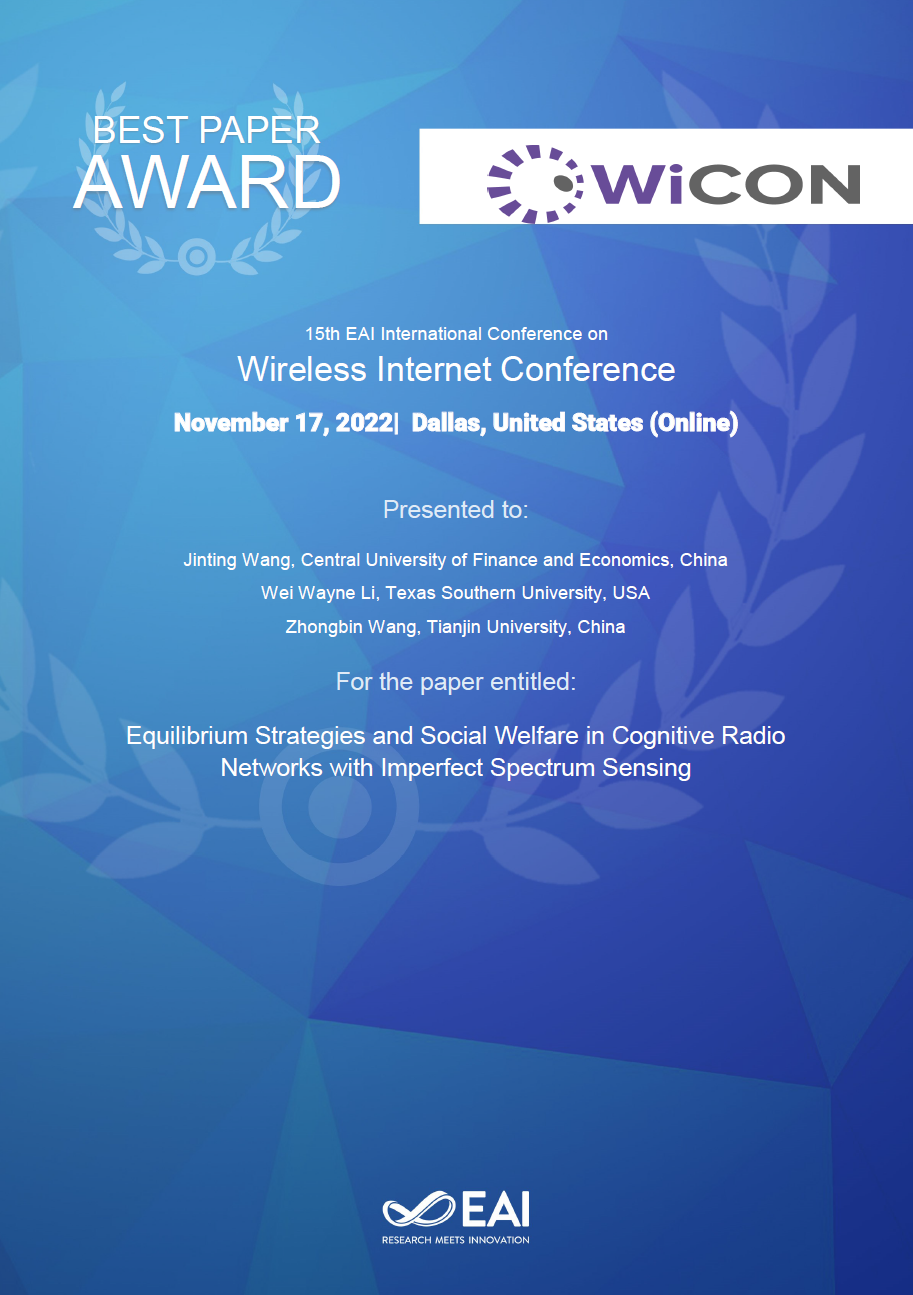 近日,2022年第15届EAI无线互联网国际会议(EAI WiCON 2022)在美国达拉斯线上召开(11月17日),beat365官网王金亭教授与合作者(美国德克萨斯南方大学Wei Wayne Li教授,天津大学王钟彬副教授)在会议上报告的论文《Equilibrium Strategies and Social Welfare in Cognitive Radio Networks with Imperfect Spectrum Sensing》创新性地采用排队博弈理论揭露了非完美的频谱感知技术对认知无线电系统的影响,经现场答辩和EAI WiCON 2022学术委员会评审,获得了本届大会的最佳论文奖。
